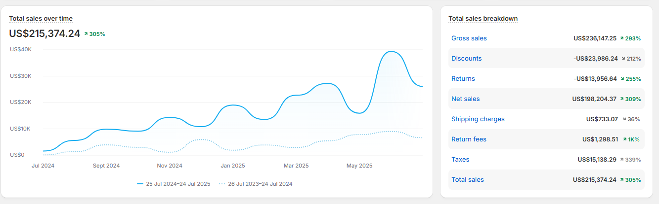 In just one year, I helped this brand grow from modest monthly sales to generating over $215,000 in total sales, representing a 305% year-over-year growth. This wasn’t luck — it was the result of a clear digital marketing strategy, precise execution, and continuous optimization.