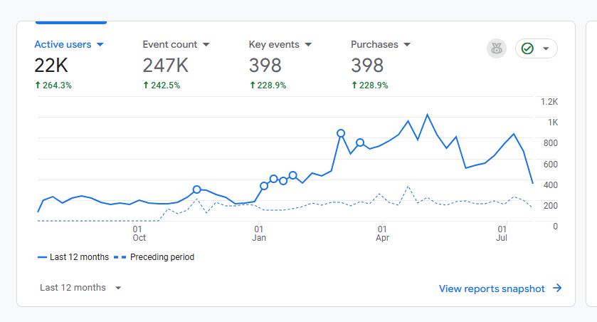 Using a combination of SEO, CRO (conversion rate optimization), content marketing, and behavioral analytics, I helped grow this store’s active user base to 22,000 users — a 264.3% increase compared to the prior period. That’s not just more traffic — that’s smarter, better-qualified traffic that led to 398 tracked purchases, up 228.9%.