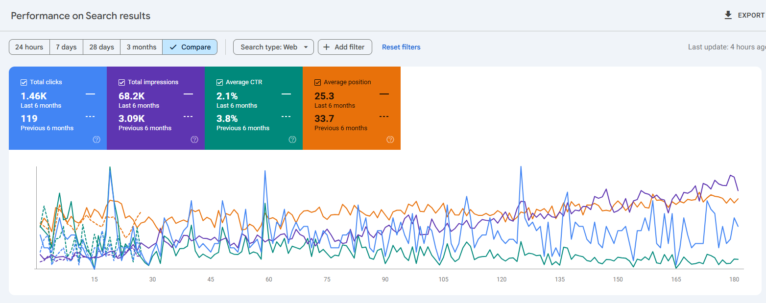 Over just 6 months, I helped Spec-Ring.com grow from 119 organic clicks to over 1,460 — a 1,127% increase in organic traffic. In the same period, total impressions skyrocketed from 3,090 to 68,200, signaling a dramatic rise in search visibility and keyword dominance.